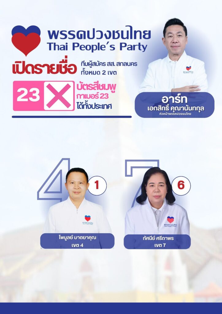 - เปิดตัวผู้สมัคร: พรรคปวงชนไทยประกาศรายชื่อผู้สมัคร สส. ในพื้นที่จังหวัดสกลนครอย่างเป็นทางการ